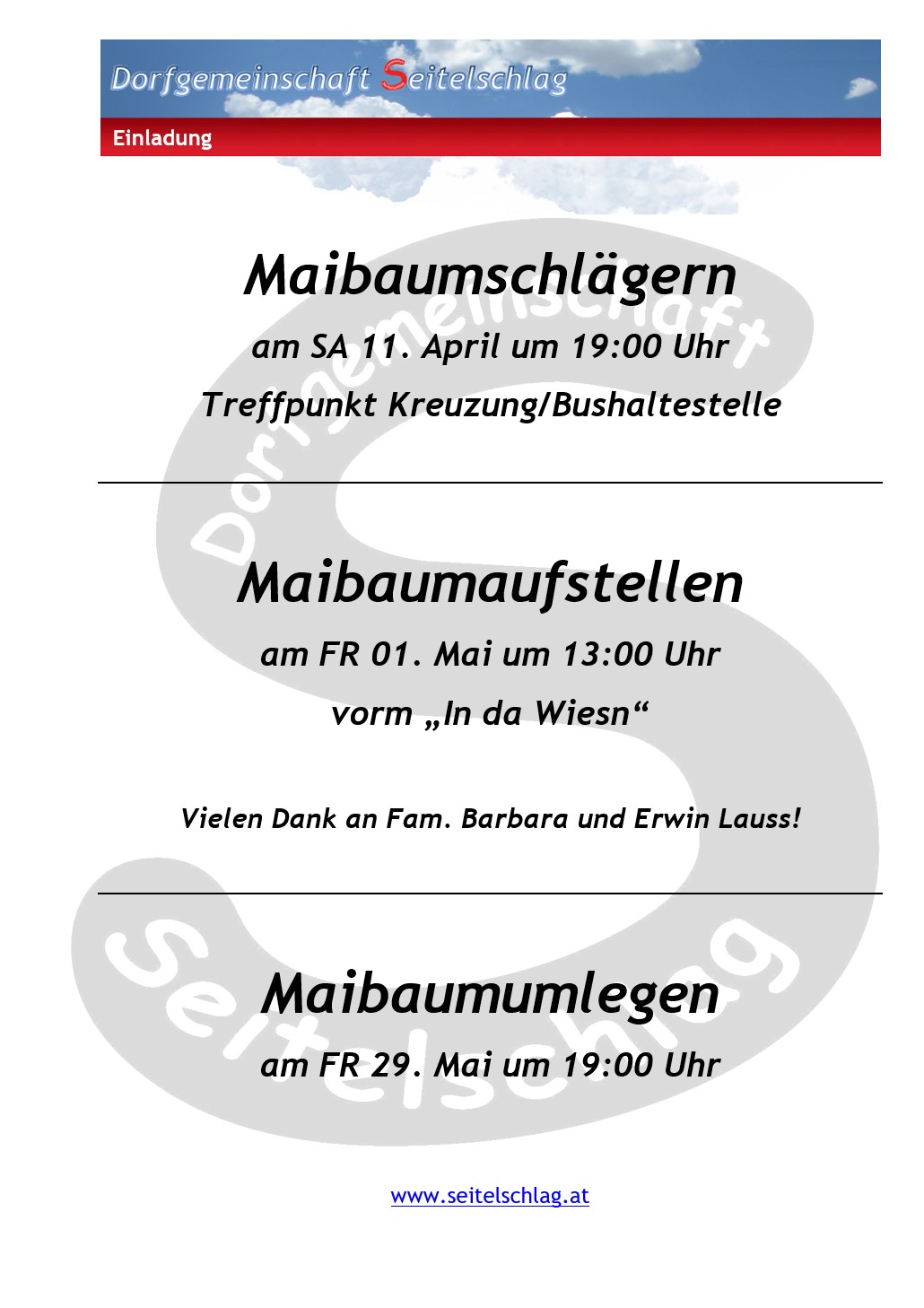 | 6 | 7 | 8 | 9 | 10 | 11Maibaum schlägern um 19 Uhr - Treffpunkt Kreuzung/Bushaltestelle | 12 |